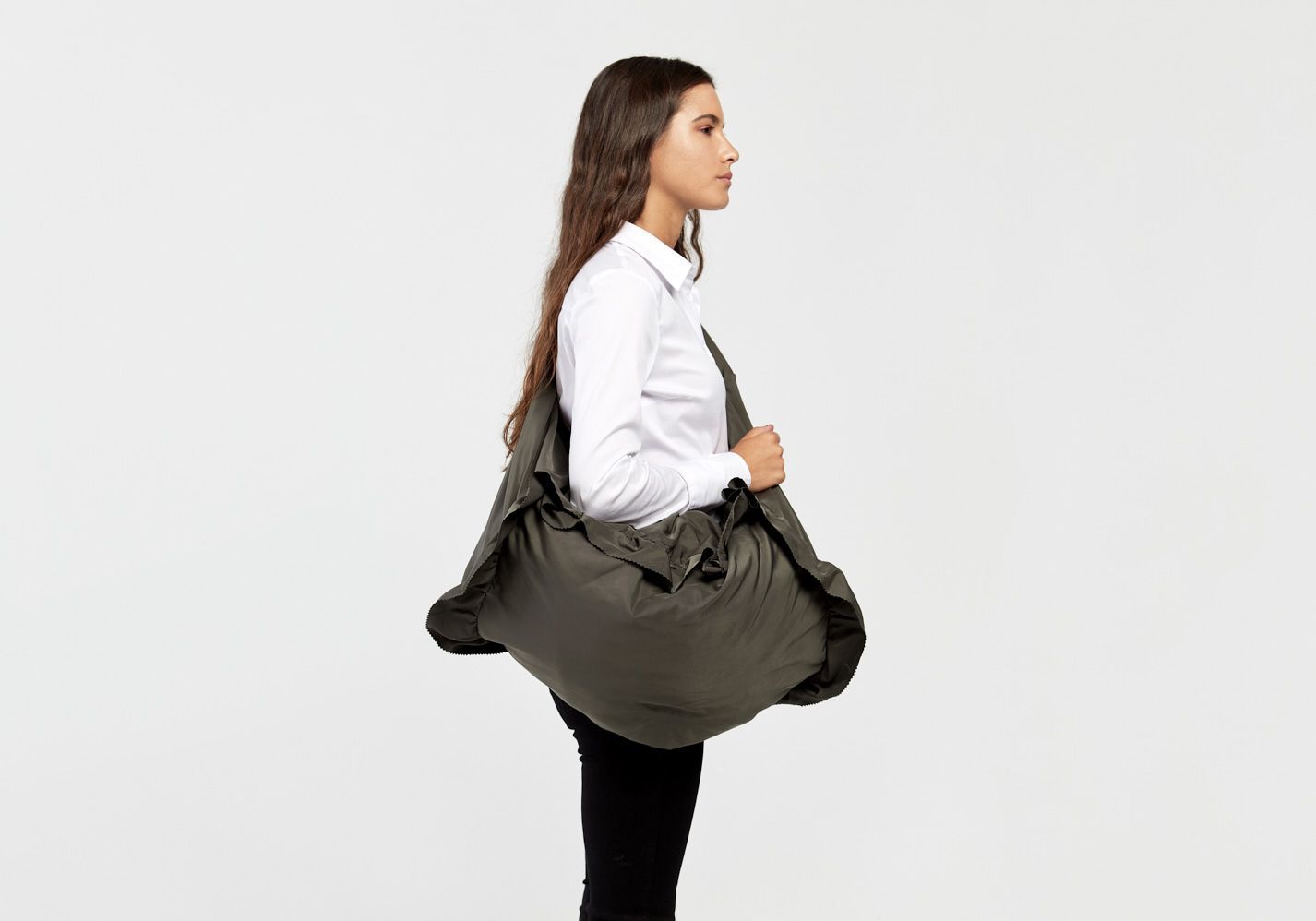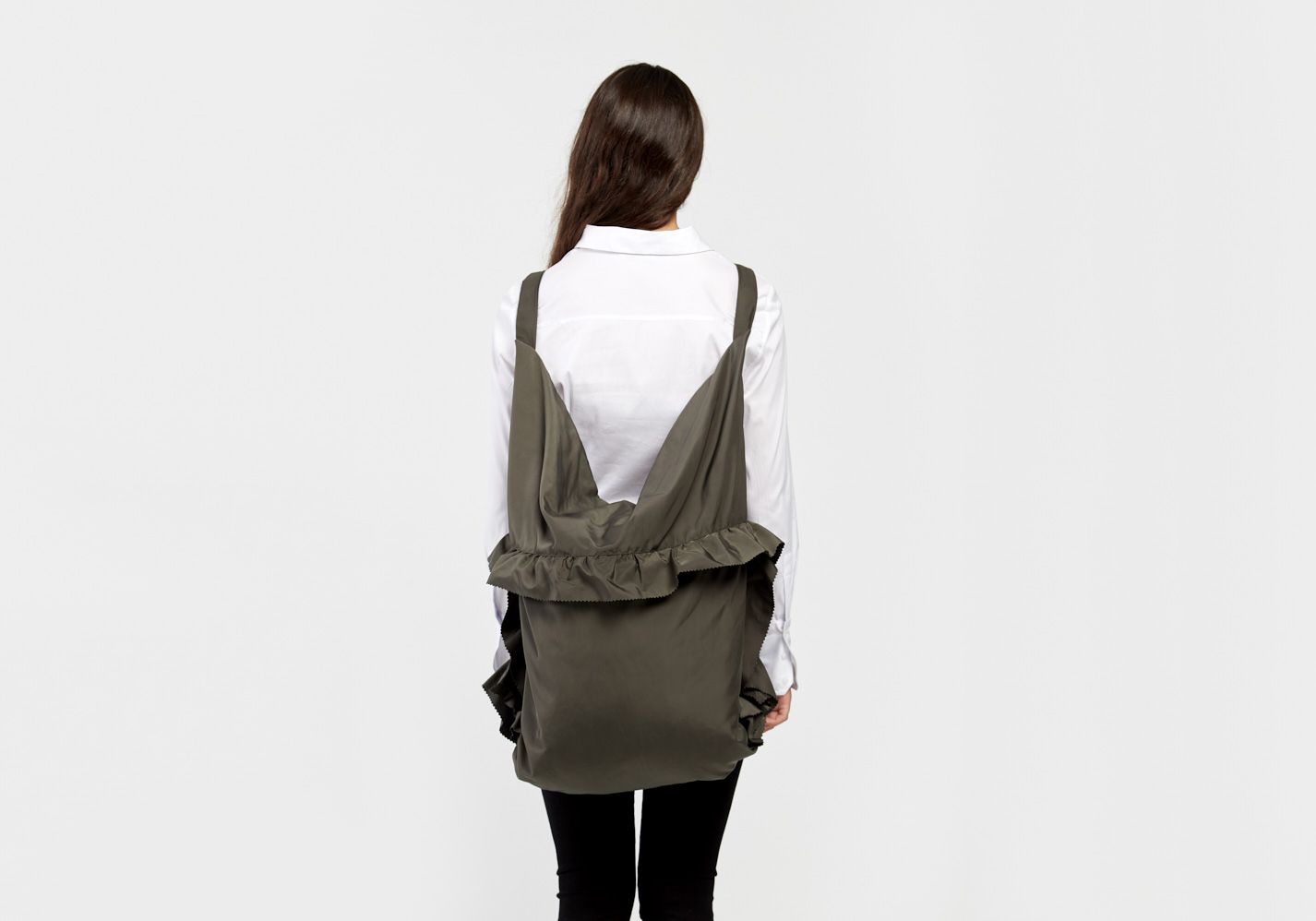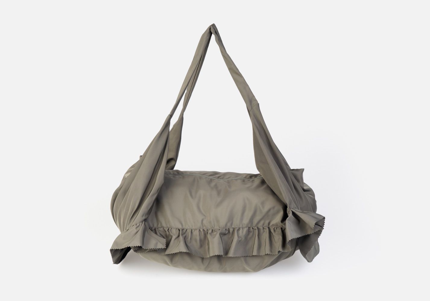 SHOULDER BAG AND BACKPACK WITH THREE POSITIONS: “NEW CONCEPT OF SPORTS BAG†IN KHAKI COLOUR TECHNICAL FABRIC WITH RUFFLED TRIM AND ZIGZAG RAW EDGE FINISH.